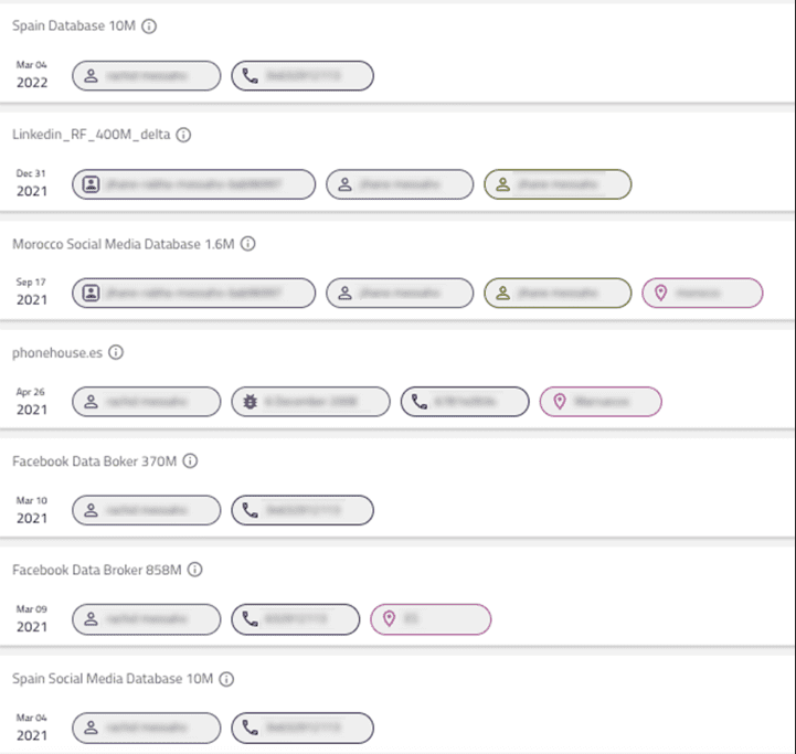 Our preliminary investigation into the exposed identities has revealed a concerning trend: many of the victims’ data were also compromised in previous, well-known data breaches i.e phonehouse.es, scrapped data from LinkedIn, Data broker sites, etc. (Some screenshots from our Hunter tool)